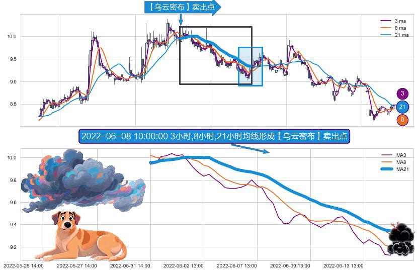 ⚀ 2022-05-31 14:00:00小时-2022-06-14 14:00:00小时显现 3小时-8小时-21小时均线 【乌云密布】卖出点 看空信号,后市看跌,卖出