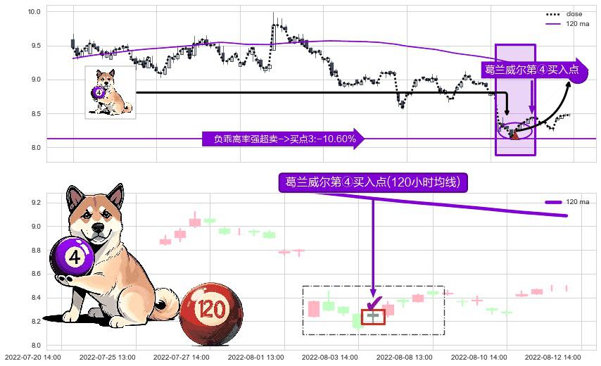 ⚀ 2022-08-04 13:00:00-小时显现 葛兰威尔均线 120小时均线 第④买入点 下降趋势均值回复的短线反弹信号,后市看涨,买进信号