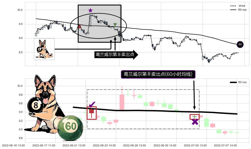 ⚀ 2022-07-04 13:00:00-小时显现 葛兰威尔均线 60小时均线 第⑧卖出点 下降趋势的中继信号,后市看跌,卖出信号