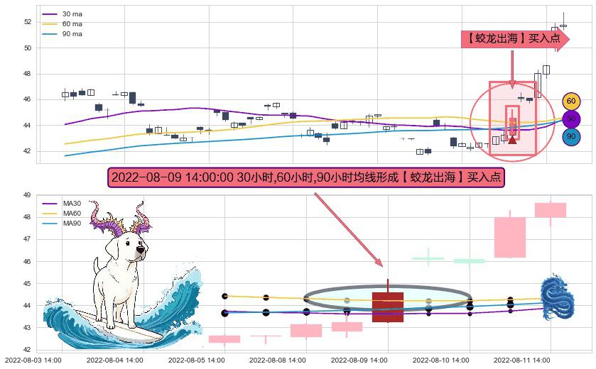 ⚀ 2022-08-09 14:00:00小时显现 30小时-60小时-90小时均线 【蛟龙出海】买入点 看多信号,后市看涨,买入