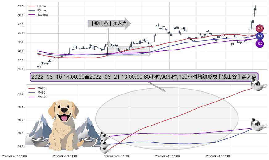 ⚀ 2022-06-13 09:00:00-小时至2022-06-21 13:00:00-小时显现 60小时-90小时-120小时均线 【银山谷】买入点 看多信号,后市看涨,买入