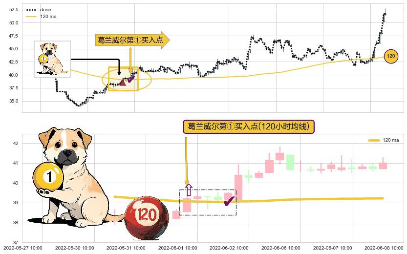 ⚀ 2022-06-01 09:00:00-小时显现 葛兰威尔均线 120小时均线 第买①入点 走势反转见底信号,后市看涨,买进信号
