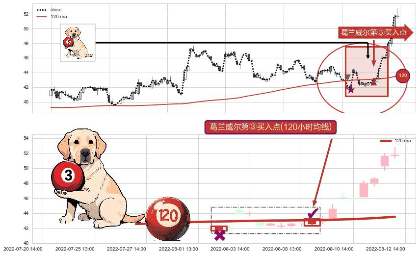 ⚀ 2022-08-08 14:00:00-小时显现 葛兰威尔均线 120小时均线 第③买入点 上升趋势的中继信号,后市看涨,买进信号