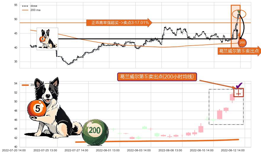 ⚀ 2022-08-12 14:00:00-小时显现 葛兰威尔均线 200小时均线 第⑤卖出点 上升趋势均值回复的短线回落信号,后市看跌,卖出信号