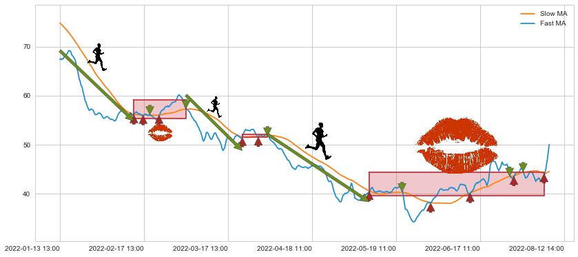 01-13 13:00至02-15 10:00 慢线与快线呈空头排列, 慢线与快线接触少,无缠绕