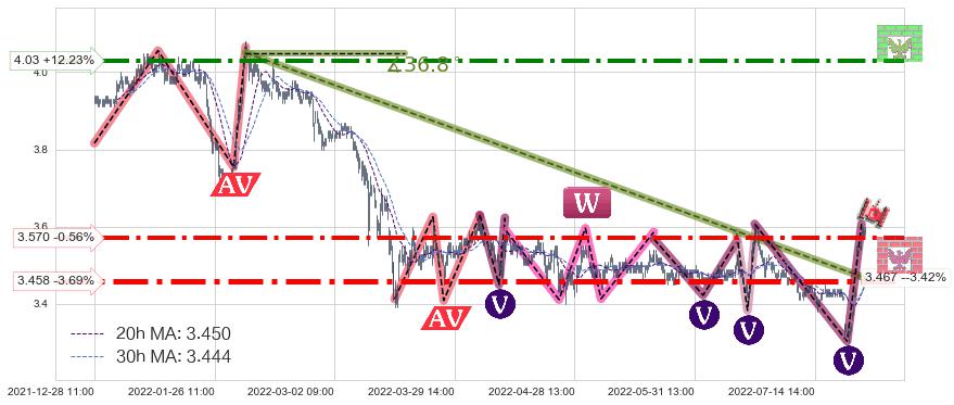 ⚔️ 2022-02-09 13:00-2022-08-10 14:00下跌趋势存在反转上涨[机会],其原下跌趋势的阻力位(3.467)已被突破[强支撑信号],原下跌趋势角度: 36.8˚