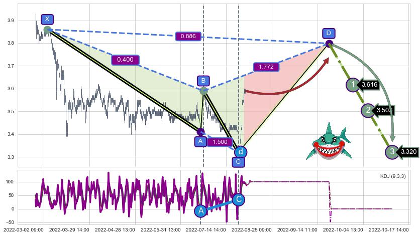 ➣ 未完成【鲨鱼】形态起点X: 03-03:13, 已到达C点: 08-03:13, 预测最终D点: 09-19:15, 共615交易小时
