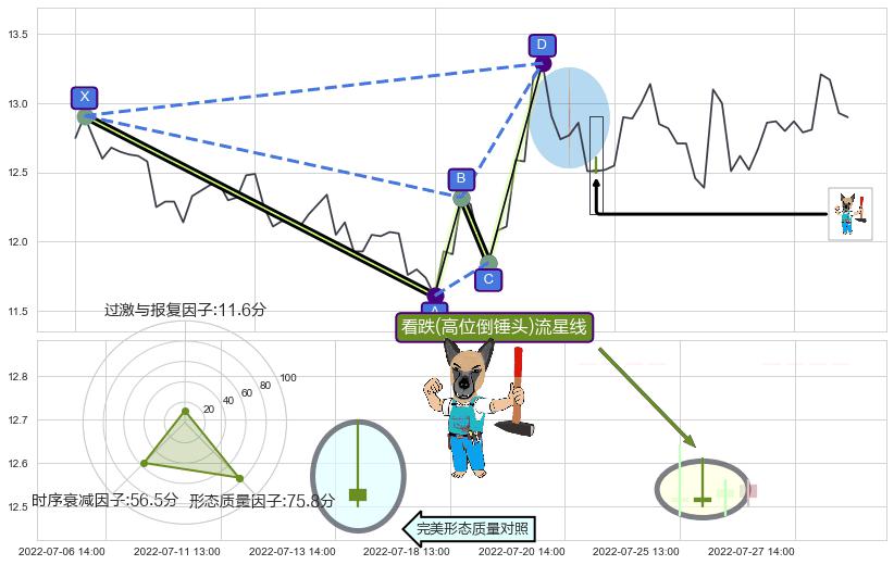 从2022-07-12 14:00至2022-07-20 14:00,共包含13个小时,阶段股价上涨13.86%,阶段股价变动位移路程比: 1 : 1.6,2022-07-20 13:00向⇪形成缺口,跳空上涨+4.93%