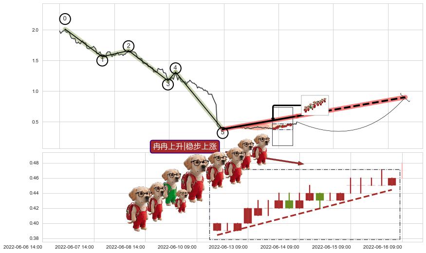 | 6 🅚:【高山滑雪】买入点 ➕ 🌊:波浪理论猜想下跌浪5已形成,猜想后续形成abc反弹上涨(均值回复) ☞ 看多信号 ⇥ 【均线】交织【图形】⇥ 综合量化分数: 52 | > |