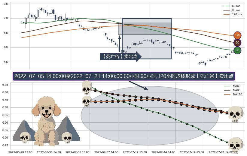 ⚀ 2022-07-06 13:00:00-小时至2022-07-21 14:00:00-小时显现 60小时-90小时-120小时均线 【死亡谷】卖出点 看空信号,后市看跌,卖出