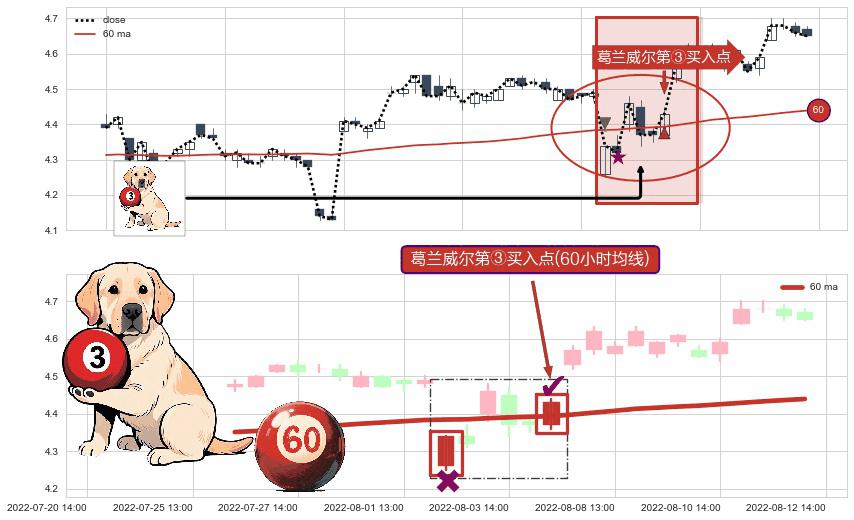 ⚀ 2022-08-04 14:00:00-小时显现 葛兰威尔均线 60小时均线 第③买入点 上升趋势的中继信号,后市看涨,买进信号
