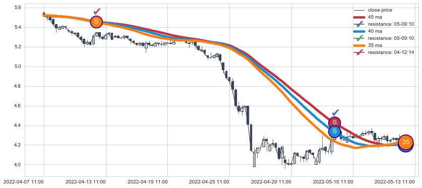➢ 最优均线组合共正确确认支撑阻力信号2处,正确确认率 40.00%