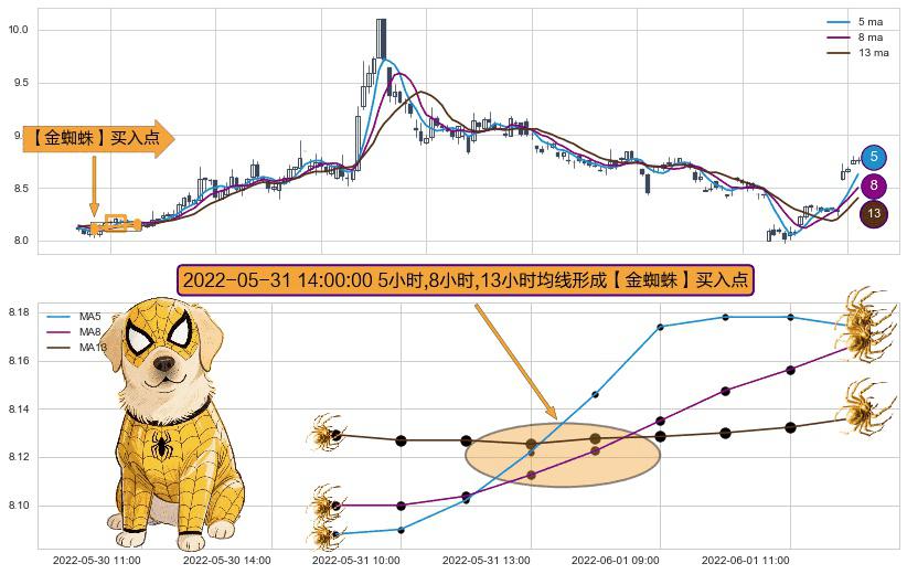 形态多维评估: ⚀ 2022-05-31 14:00:00小时显现 5小时-8小时-13小时均线 【金蜘蛛】买入点 看多信号,后市看涨,买入