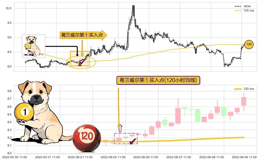 形态多维评估: ⚀ 2022-06-02 10:00:00-小时显现 葛兰威尔均线 120小时均线 第买①入点 走势反转见底信号,后市看涨,买进信号