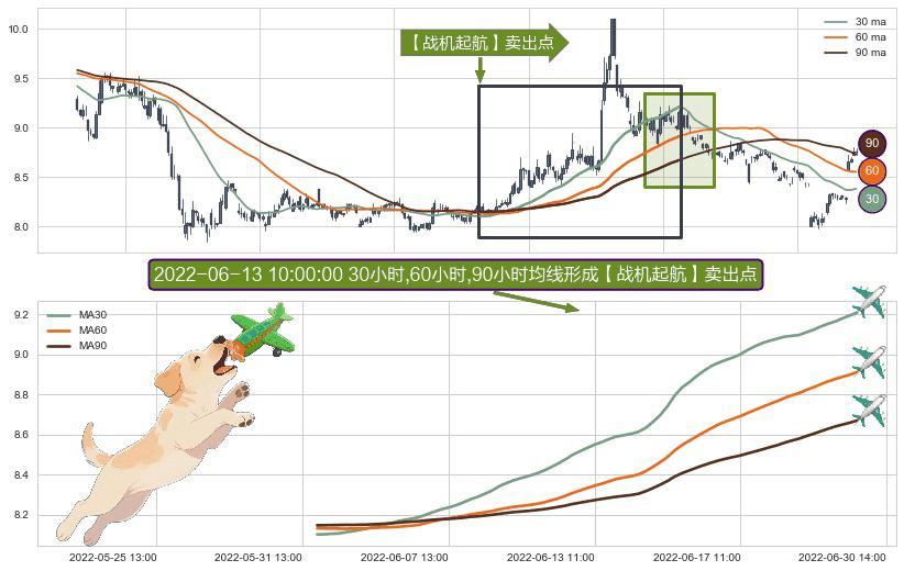 形态多维评估: ⚀ 2022-06-01 09:00:00小时-2022-06-28 14:00:00小时显现 30小时-60小时-90小时均线 【战机起航】卖出点 看空信号,后市看跌,卖出