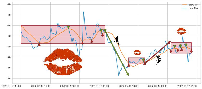 06-23 14:00至08-11 14:00 慢线与快线多次接触,存在上下穿越,有缠绕