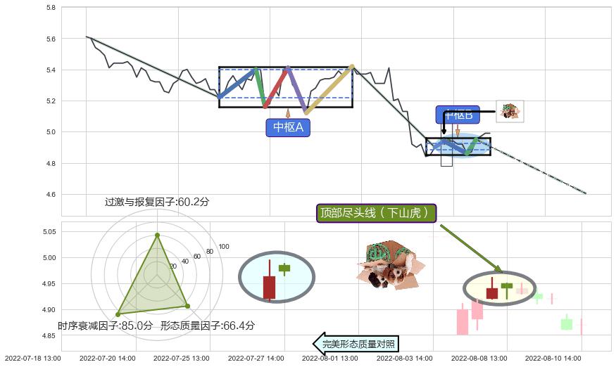 从2022-06-01 14:00至2022-08-11 14:00,共包含136个小时,阶段股价下跌-13.17%,阶段股价变动位移路程比: 1 : 8,下跌趋势角度: 24.5,2022-08-02 13:00向↘︎形成缺口,跳空下跌-4.09%˚