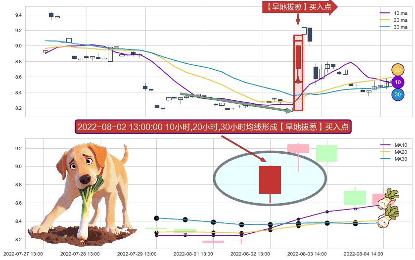 ⚀ 2022-08-02 13:00:00小时显现 10小时-20小时-30小时均线 【旱地拔葱】买入点 看多信号,后市看涨,买入