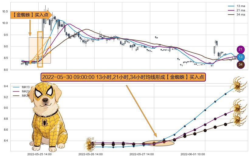 ⚀ 2022-05-30 09:00:00小时显现 13小时-21小时-34小时均线 【金蜘蛛】买入点 看多信号,后市看涨,买入
