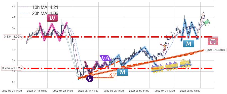 ♘ 支撑价格位3.834,可信任强度85.45%,距离最后交易2022-08-12 14:00形成的收盘价格4.17相差 -8.05%
