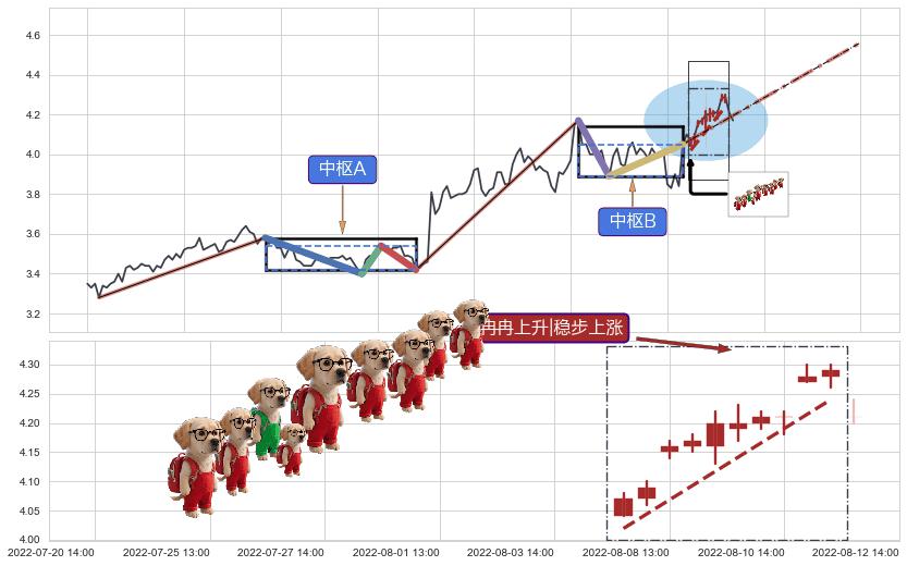 从2022-04-27 09:00至2022-08-12 14:00,共包含249个小时,阶段股价上涨32.50%,阶段股价变动位移路程比: 1 : 6,上涨趋势角度: 22.3,2022-06-20 13:00向⇪形成缺口,跳空上涨+10.12%