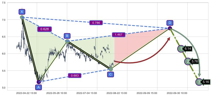 ➢ 距离预测D点位置有足够的上涨空间, 与看跌【伽利】形态相反,实际方向【看涨】