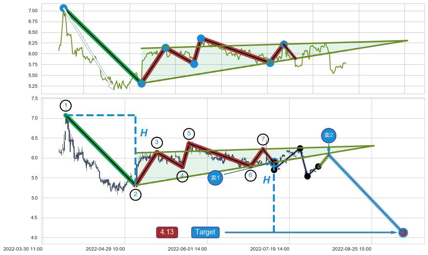 ➣ D点拟合预测价格6.74,距离最后交易收盘价格5.77相差 +16.86%
