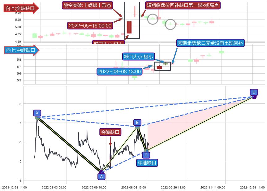 ➣ 突破缺口形成后,后续k已经超过14根,跳空突破【蝴蝶】形态关键点后, 出现【中度回踩】迹象,短期收盘价回补缺口第二根k线低点