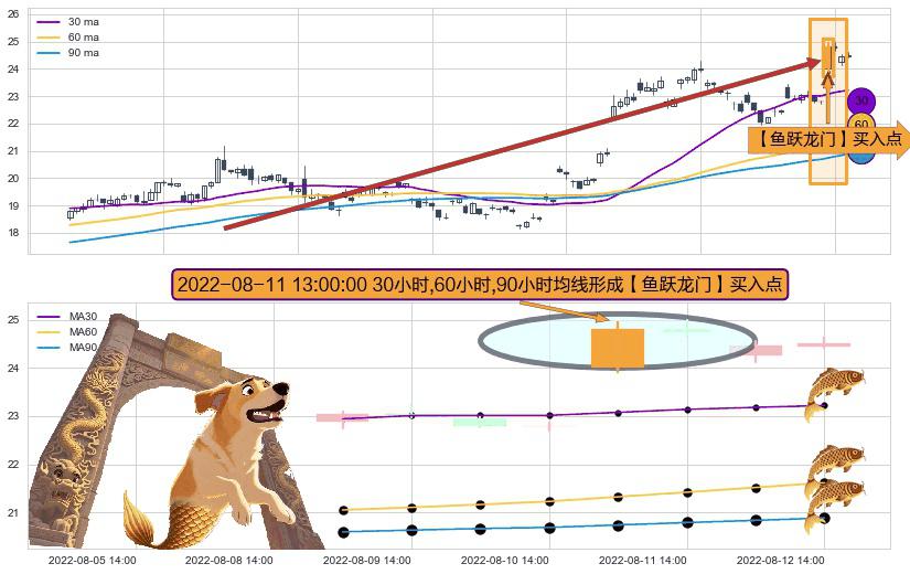 形态多维评估: ⚀ 2022-08-11 13:00:00小时显现 30小时-60小时-90小时均线 【鱼跃龙门】买入点 看多信号,后市看涨,买入