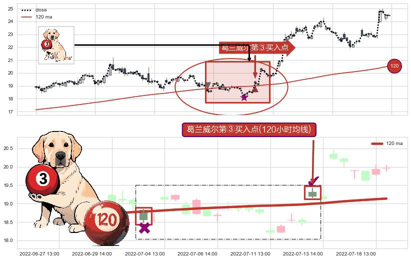 形态多维评估: ⚀ 2022-07-13 13:00:00-小时显现 葛兰威尔均线 120小时均线 第③买入点 上升趋势的中继信号,后市看涨,买进信号