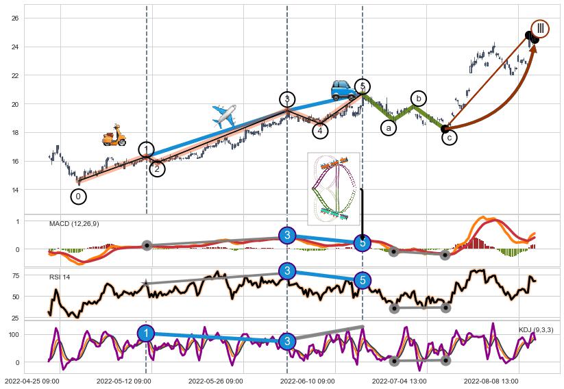 ➢ a,c调整浪MACD, RSI, KDJ走势都【未出现】背离,abc走势延续, 5浪反转概率增强