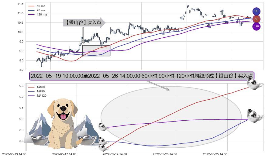 形态多维评估: ⚀ 2022-05-19 11:00:00-小时至2022-05-26 14:00:00-小时显现 60小时-90小时-120小时均线 【银山谷】买入点 看多信号,后市看涨,买入