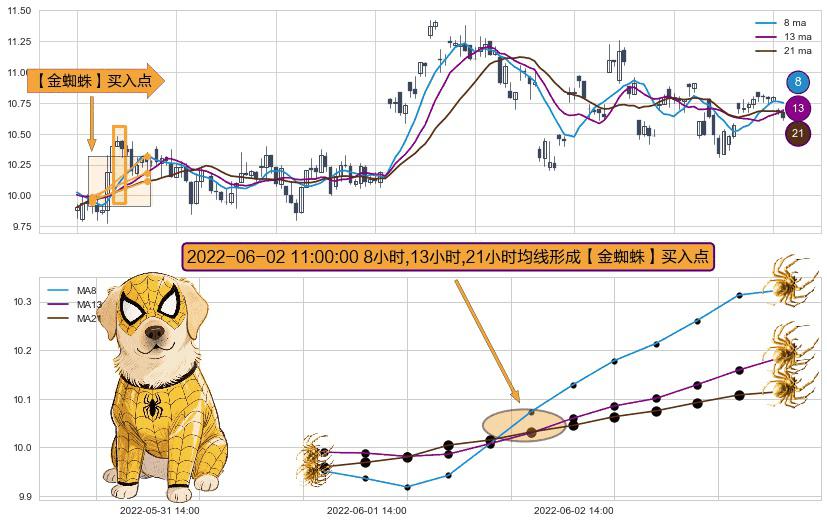 形态多维评估: ⚀ 2022-06-02 11:00:00小时显现 8小时-13小时-21小时均线 【金蜘蛛】买入点 看多信号,后市看涨,买入