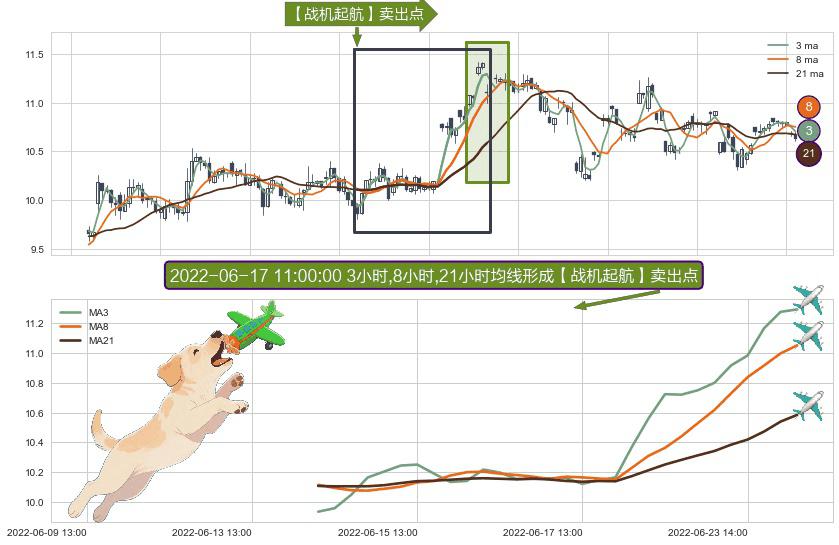 形态多维评估: ⚀ 2022-06-14 11:00:00小时-2022-06-27 13:00:00小时显现 3小时-8小时-21小时均线 【战机起航】卖出点 看空信号,后市看跌,卖出