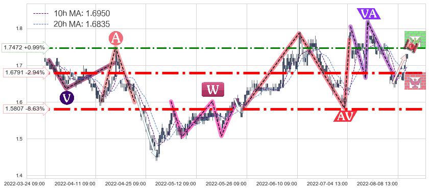 ♘ 阻力价格位1.7472,可信任强度65.62%,距离最后交易2022-08-12 14:00形成的收盘价格1.7300相差 +0.99%