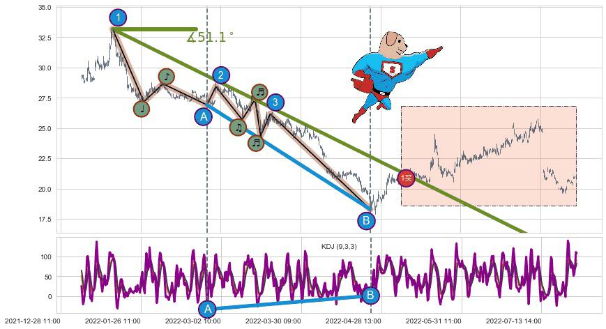 从2022-01-17 11:00至2022-05-20 14:00,共包含402个小时,阶段股价下跌-37.52%,阶段股价变动位移路程比: 1 : 7,下跌趋势角度: 51.1