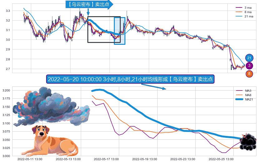 形态多维评估: ⚀ 2022-05-16 10:00:00小时-2022-05-26 10:00:00小时显现 3小时-8小时-21小时均线 【乌云密布】卖出点 看空信号,后市看跌,卖出