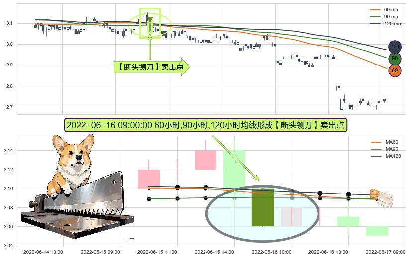 形态多维评估: ⚀ 2022-06-16 09:00:00小时显现 60小时-90小时-120小时均线 【断头铡刀】卖出点 看空信号,后市看跌,卖出