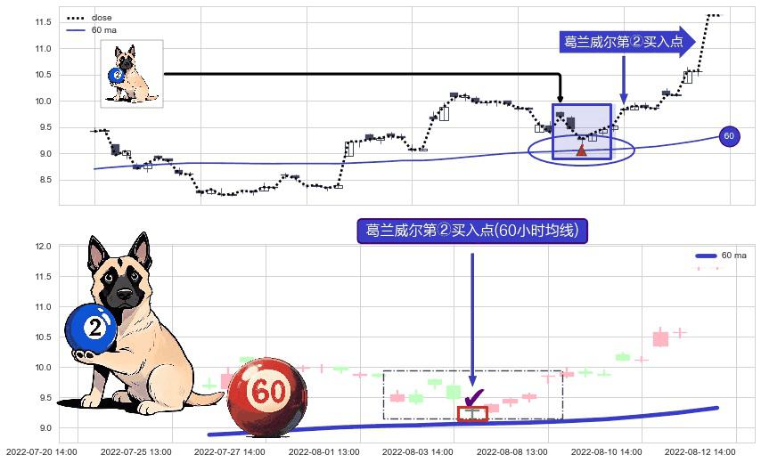 ⚀ 2022-08-04 13:00:00-小时显现 葛兰威尔均线 60小时均线 第②买入点 上升趋势的中继信号,后市看涨,买进信号