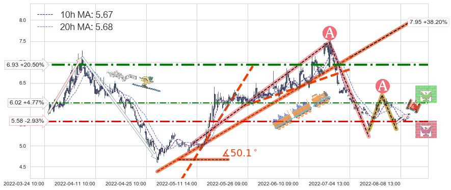 ♘ 阻力价格位6.02,可信任强度43.54%,距离最后交易2022-08-12 14:00形成的收盘价格5.75相差 +4.77%