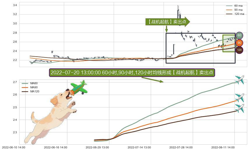 ⚀ 2022-06-23 14:00:00小时-2022-08-12 13:00:00小时显现 60小时-90小时-120小时均线 【战机起航】卖出点 看空信号,后市看跌,卖出
