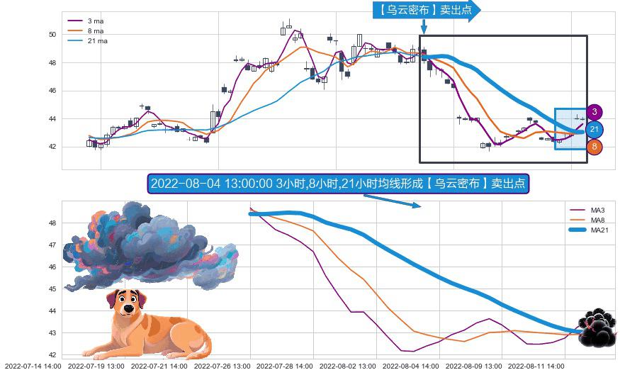 形态多维评估: ⚀ 2022-07-26 13:00:00小时-2022-08-12 14:00:00小时显现 3小时-8小时-21小时均线 【乌云密布】卖出点 看空信号,后市看跌,卖出