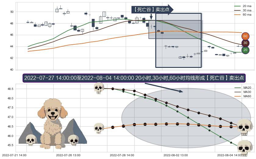 形态多维评估: ⚀ 2022-07-28 13:00:00-小时至2022-08-04 14:00:00-小时显现 20小时-30小时-60小时均线 【死亡谷】卖出点 看空信号,后市看跌,卖出