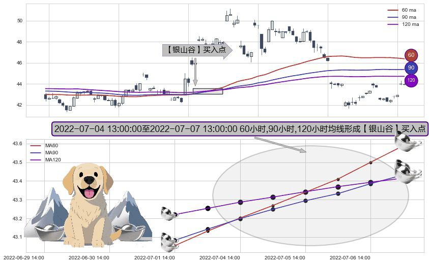形态多维评估: ⚀ 2022-07-04 14:00:00-小时至2022-07-07 13:00:00-小时显现 60小时-90小时-120小时均线 【银山谷】买入点 看多信号,后市看涨,买入