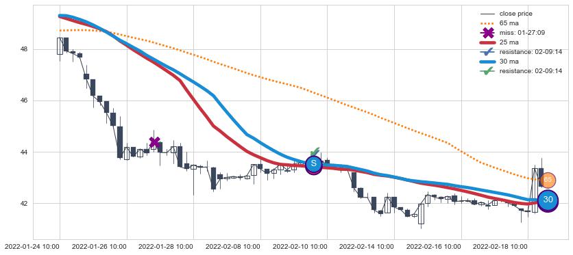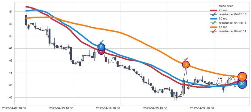 下跌趋势04-07 10:00-05-06 10:00,均线65, 25, 30确认关键阻力2处