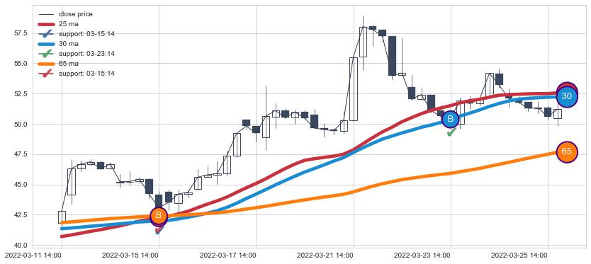 上涨趋势03-11 14:00-03-28 09:00,均线65, 25, 30确认关键支撑2处
