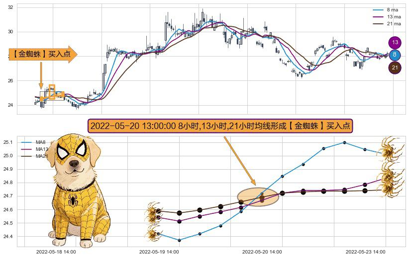 形态多维评估: ⚀ 2022-05-20 13:00:00小时显现 8小时-13小时-21小时均线 【金蜘蛛】买入点 看多信号,后市看涨,买入