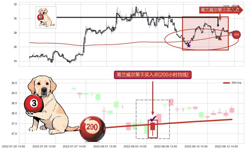 形态多维评估: ⚀ 2022-08-04 13:00:00-小时显现 葛兰威尔均线 200小时均线 第③买入点 上升趋势的中继信号,后市看涨,买进信号