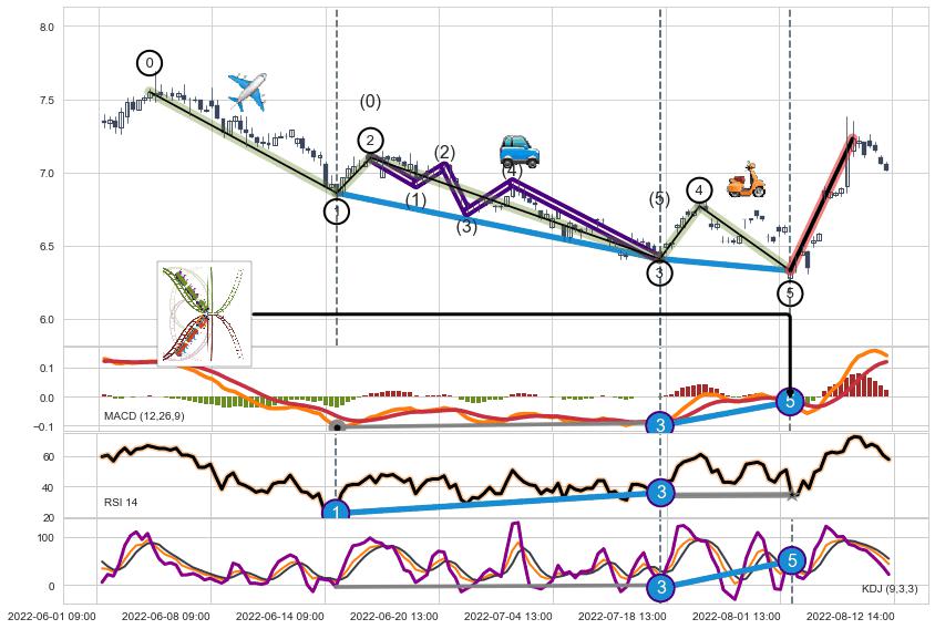 ➣ 1,3,5驱动浪MACD, RSI, KDJ走势都出现【常规背离】反转信号增强