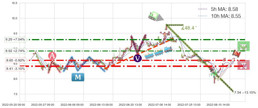 ♘ 支撑价格位8.60,可信任强度80.55%,距离最后交易2022-08-12 14:00形成的收盘价格8.68相差 -0.92%